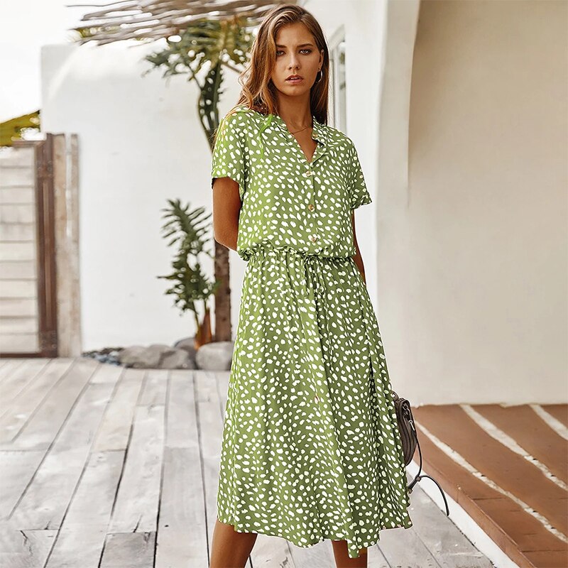 2021 New Summer Women's Elegant Short Sleeve Polka Dot Print Dress Shirt Collar Button Lace Up Temperament Ladies Long Dress