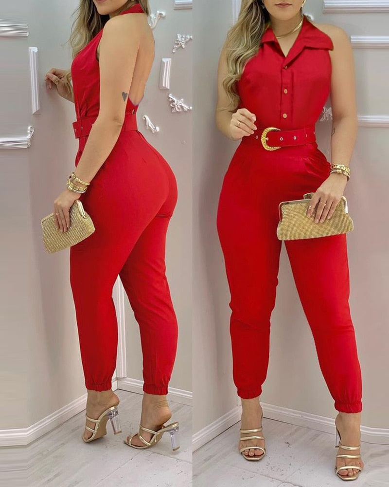2022 Women Summer Sping Plain Thick Strap Jumpsuit With Belt V-Neck Thick Strap Sleeveless Solid Casual