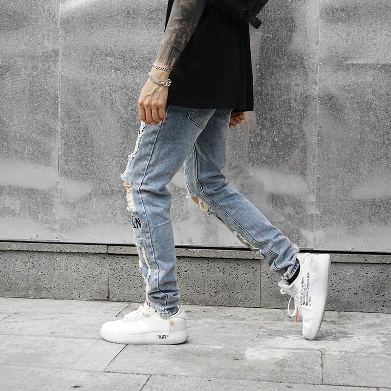 3XL Hole Skinny Jeans Men Streetwear Letter Print Patchwork Straight Pencil Pants Male Vaqueros Hombre Hip Hop Trousers