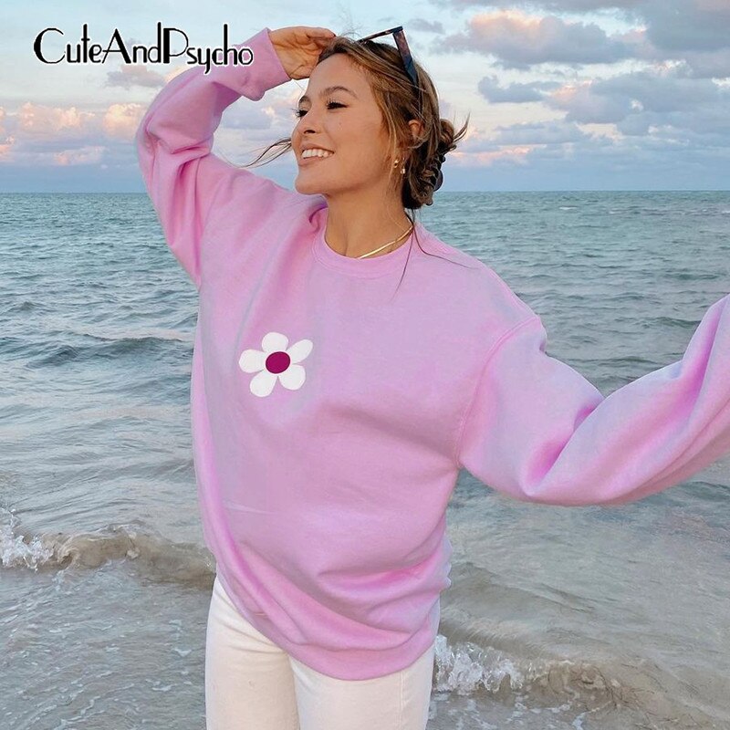 Autumn Streetwear Loose Y2K Sweatshirts Crewneck Floral Print Cute Clothes Aesthetic 2000s Fashion Retro Tops Tee Cuteandpsycho