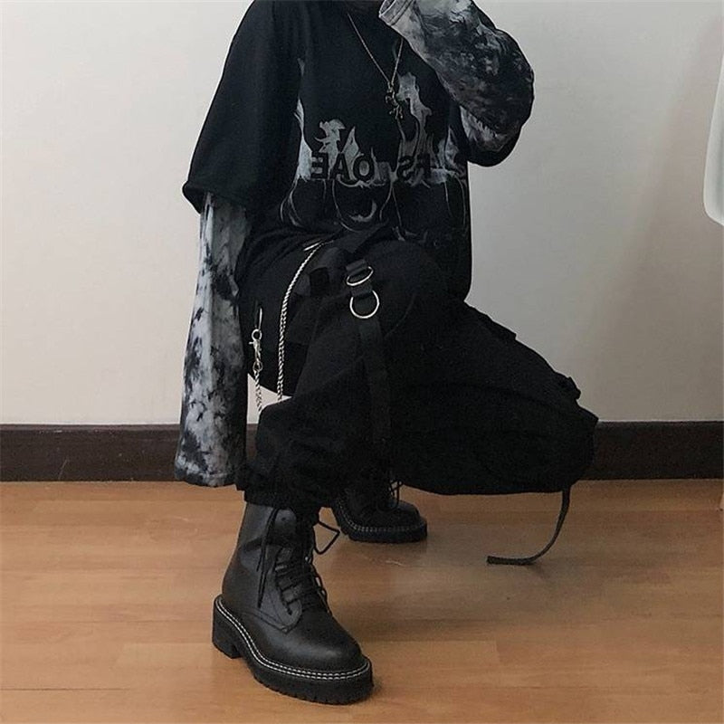 Black Harajuku Pants Streetwear Women Casual Harem Pants With Chain Solid Rock Fashion High Street Hip Hop Long Trousers Capris