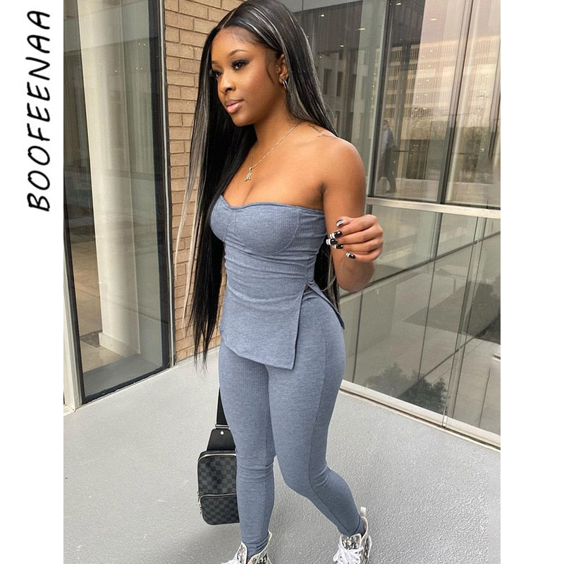 BOOFEENAA Solid Color Rib Knit Two Piece Set Women Sexy Summer Outfits Tube Top Pants Matching Sets Wholesale Items C85-DZ33