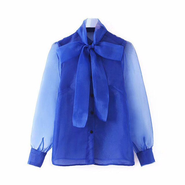 Chic Bow Collar Women Solid Blouse Elegant Organza Top Long Sleeve Stylish Blue Transparent Shirt Female Button Blouse Tunic