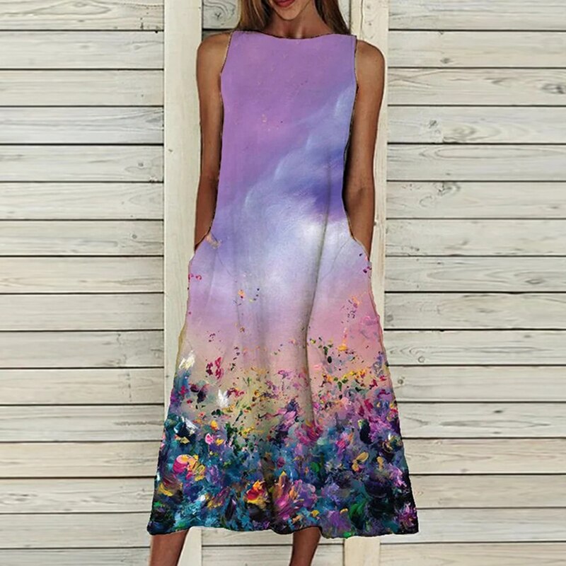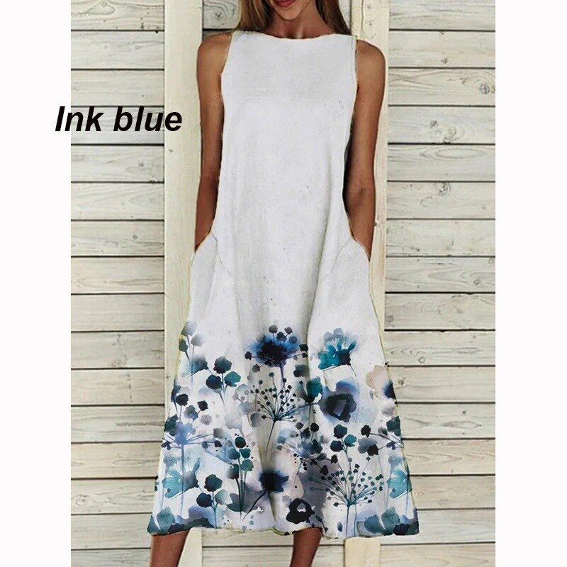 Dress 2022 O Neck Flower Print Summer Dresses For Women Fashion Pocket Sleeveless Dress Female Casual Loose Party Dress