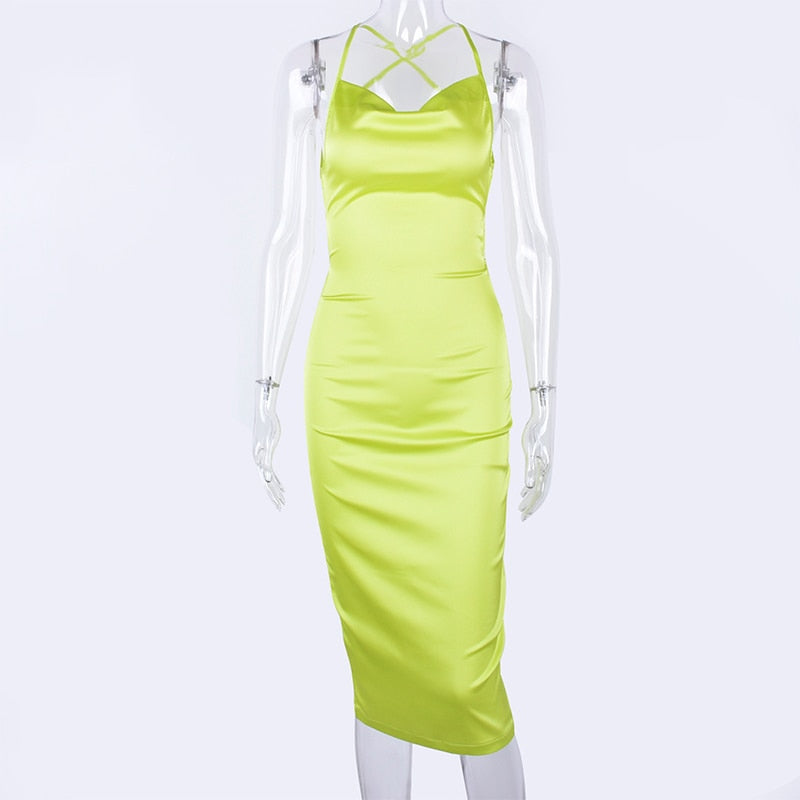 Dulzura neon satin lace up 2021 summer women bodycon long midi dress sleeveless backless elegant party outfits sexy club clothes
