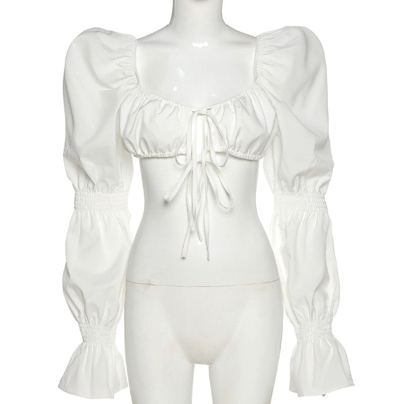 Dulzura puff long sleeve ruffle lace up women crop top shirts elegant ruched hollow out 2020 autumn winter clothes party Korea