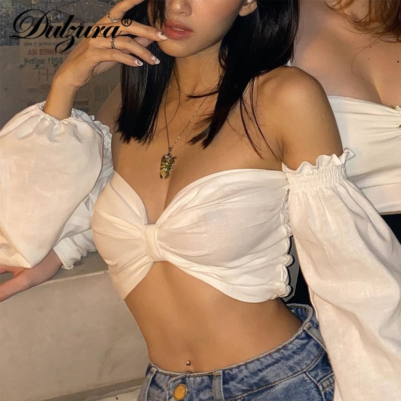 Dulzura Ruched Bow Women White Shirts Crop Top Puff Long Sleeve Off Shoulder Elegant Party Streetwear 2020 Autumn Winter Club