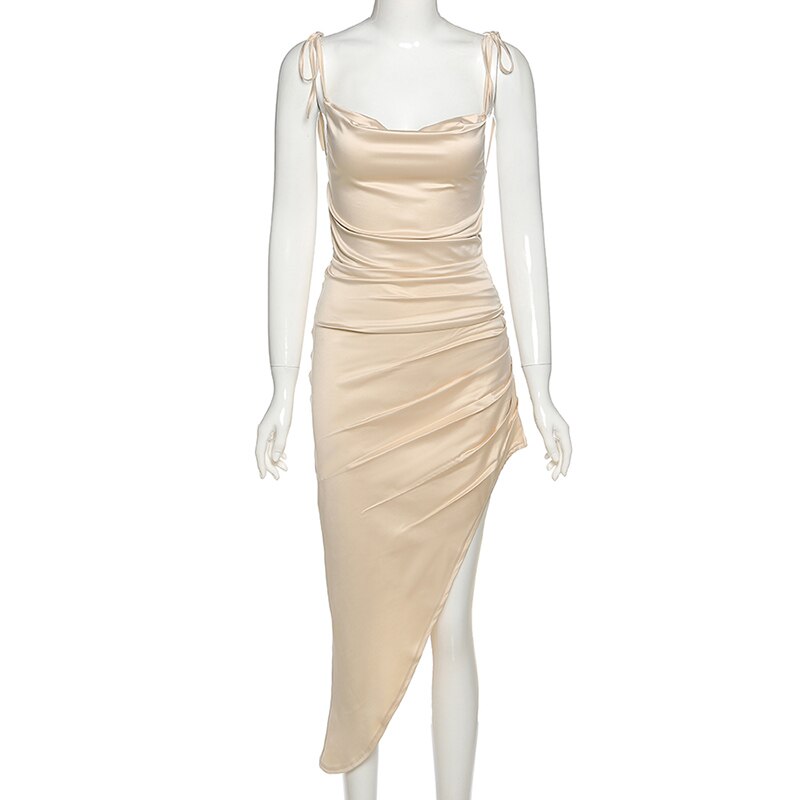 Dulzura satin lace up women ruched midi dress irregular bandage side high slit backless bodycon sexy streetwear party elegant