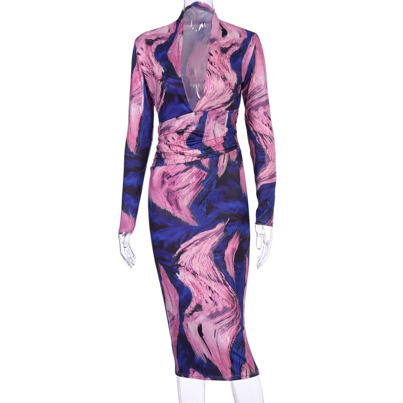 Dulzura tie dye print women midi dress deep v neck bodycon sexy party streetwear 2019 autumn winter clothes Christmas elegant