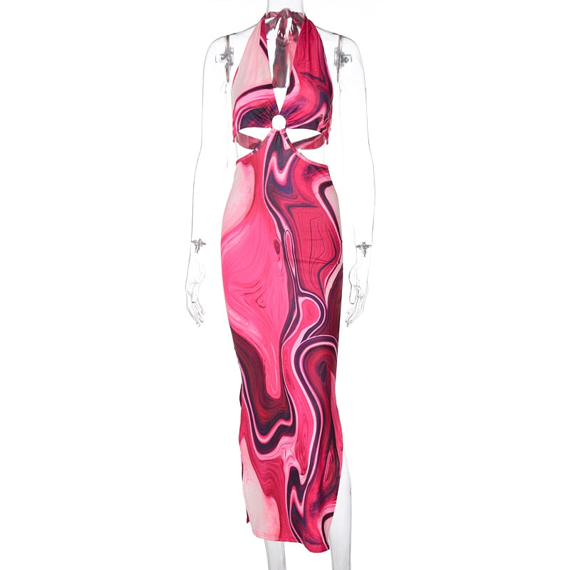 Dulzura Tie Dye Women Halter Midi Dress Hollow Out Lace Up Slit Bandage Bodycon Sexy Streetwear Party Club Elegant 2021 Summer