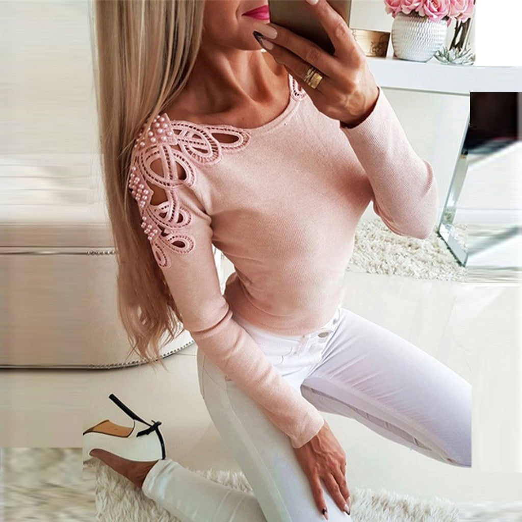 Fashion Bling Beading Hollow Blouse Casual Winter Ladies Sexy Slim Bottom Tops Female Women Long Sleeve Shirt Blusas Pullover