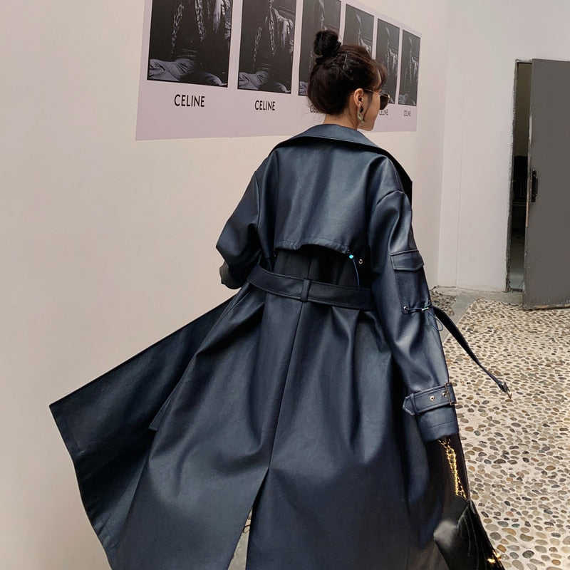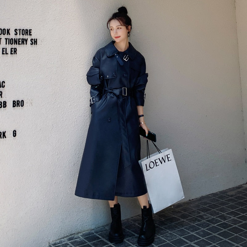 Fashion Elegant European Style Long PU Leather Trench Coat Women Double-Breasted with Belt Spring Autumn Lady Outerwear