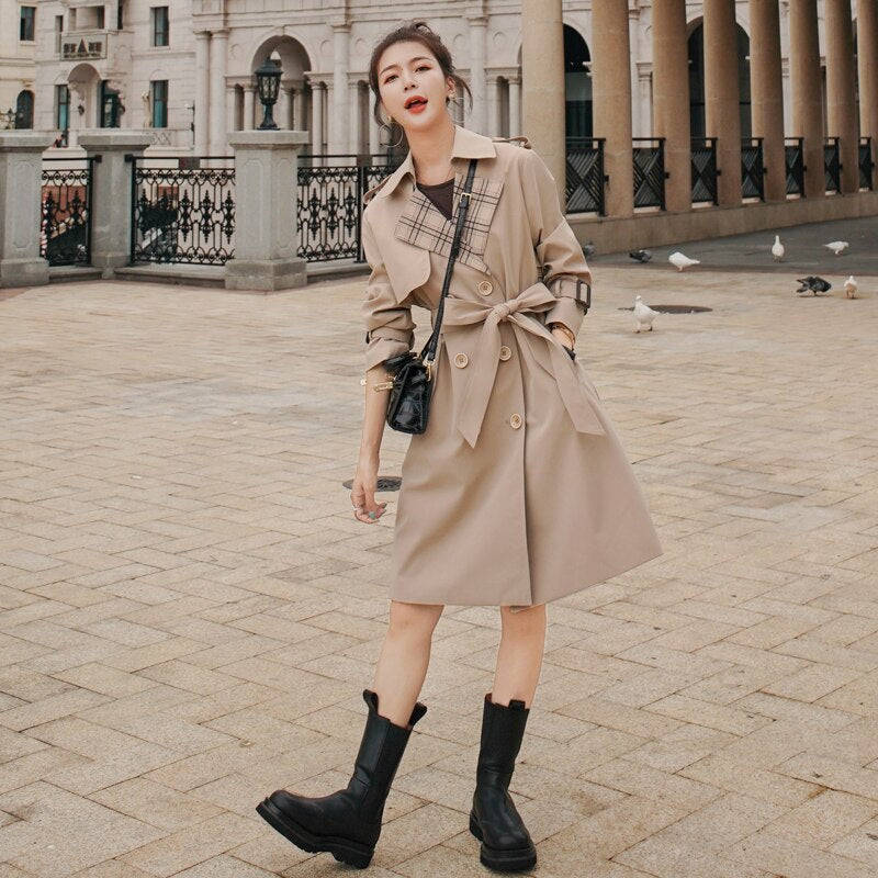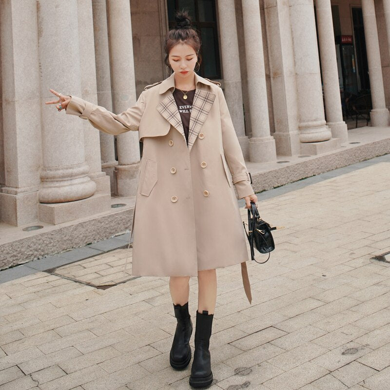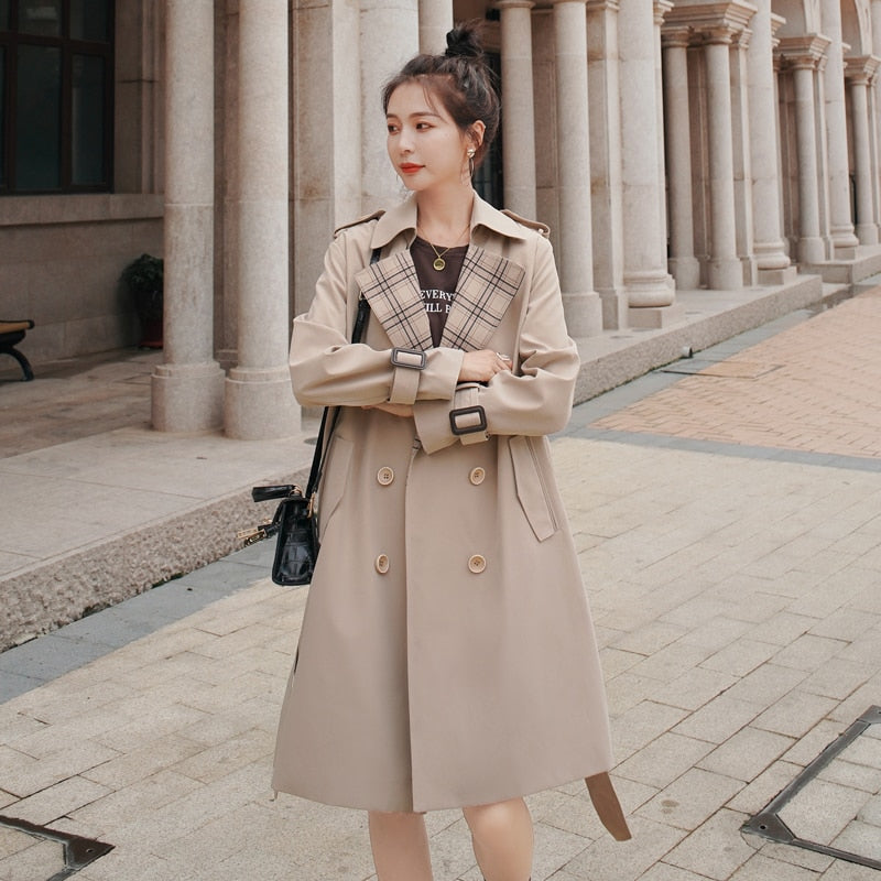 Fashion England Style Women Trench Coat Double-Breasted Long Duster Coat Plaid Patchwork Outerwear Spring Autumn Windbreaker