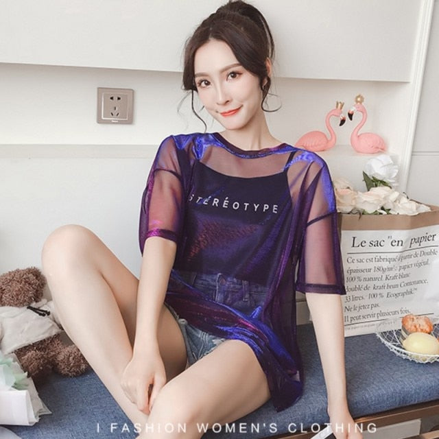 Fashion Hollow Out T Shirt Women Sexy Transparent Summer Tops Ladies Short Sleeve Loose Two set T-Shirts Women Tee Shirt