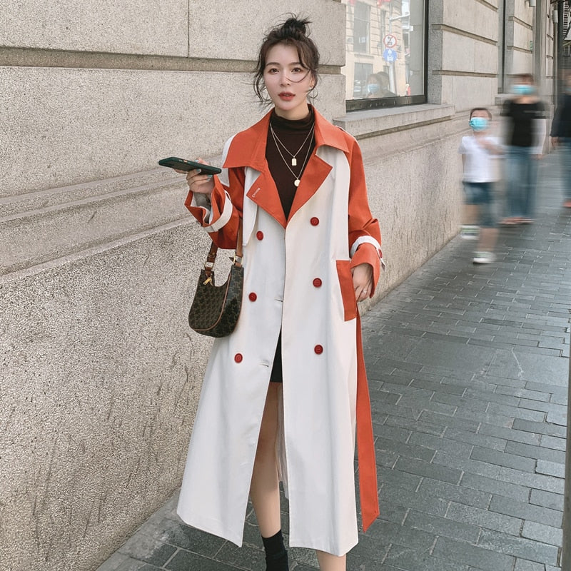 Fashion New Lady Trench Coat Long Double-Breasted with Belt Duster Coat for Women Spring Fall Outerwear Female Clothes Patchwork
