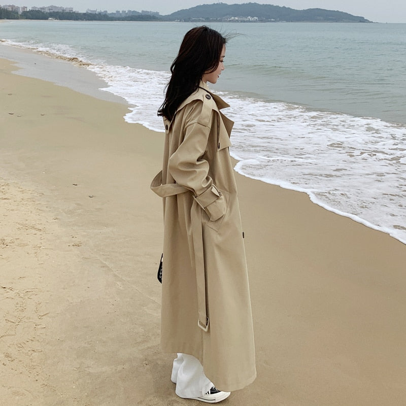 Fashion New Loose Oversize Long Trench Coat Women Double-Breasted with Belt Khaki Duster Coat for Lady Spring Autumn Outerwear