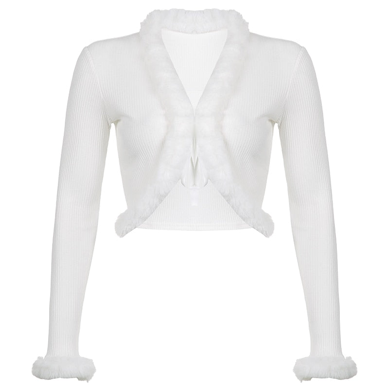 Fur Patchwork Vintage Y2K Cardigans Autumn Harajuku Lace-up Long Sleeve Knit Tops Casual Retro 90s Cropped Outfits Cuteandpsycho