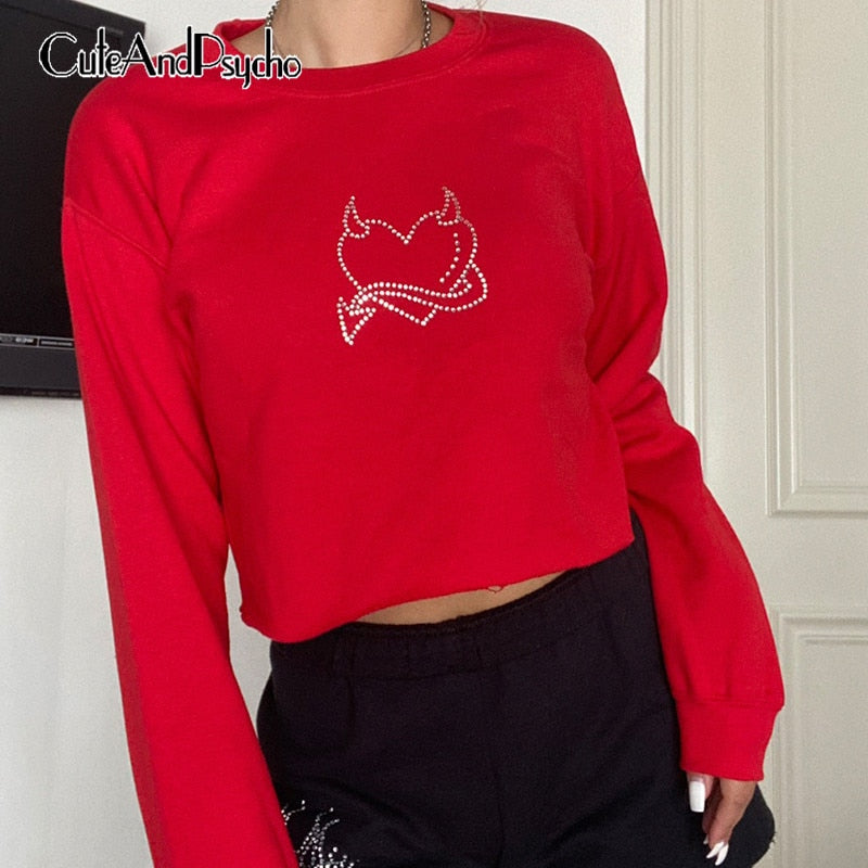 Heart Rhinestone Print Crop Sweatshirts Joggers Women Streetwear Autumn Casual Tops Crewneck Loose Cute 90s Shirts Cuteandpsycho