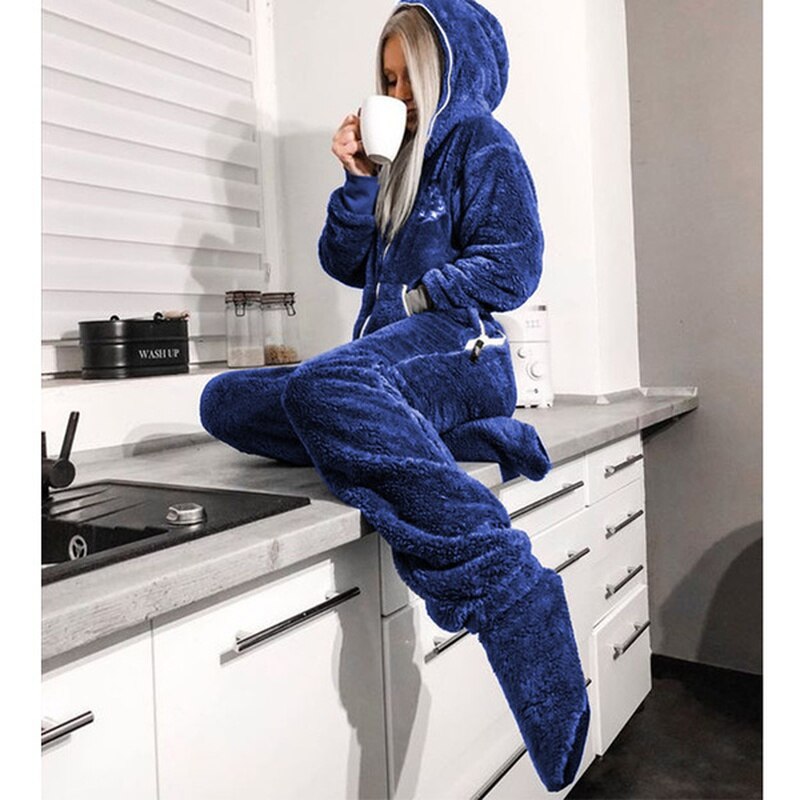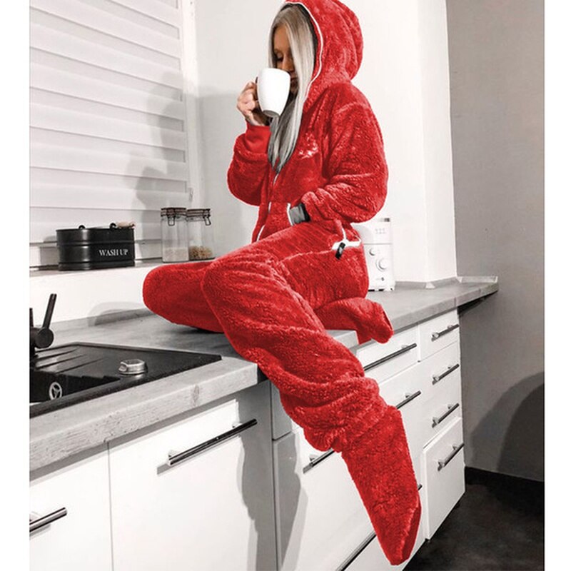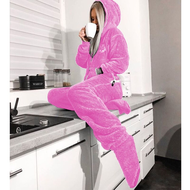 Jumpsuit Women Flannel Long Sleeve Jump Suits for Woman Homewear Pajamas Romers Solid Color Ladies Hooded Jumpsuits Outfits