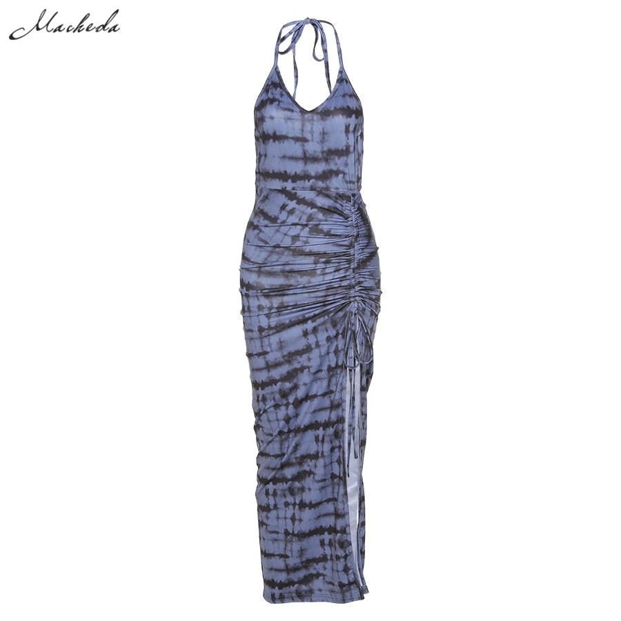 Macheda Autumn Fashion Slim Halter Dress Women Sexy Sleeveless V Neck Hem High Split Printing Clothing Lady Bodycon Long Dresses