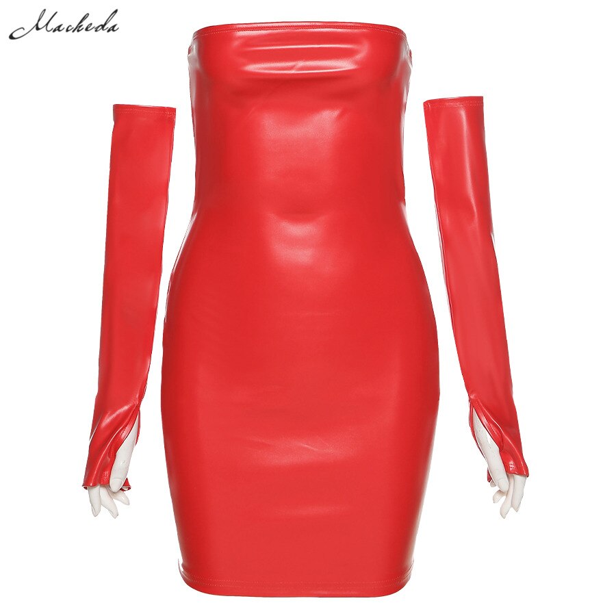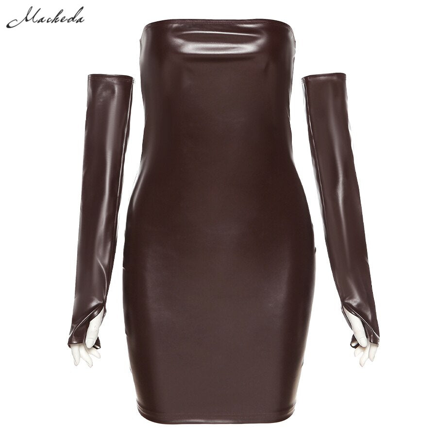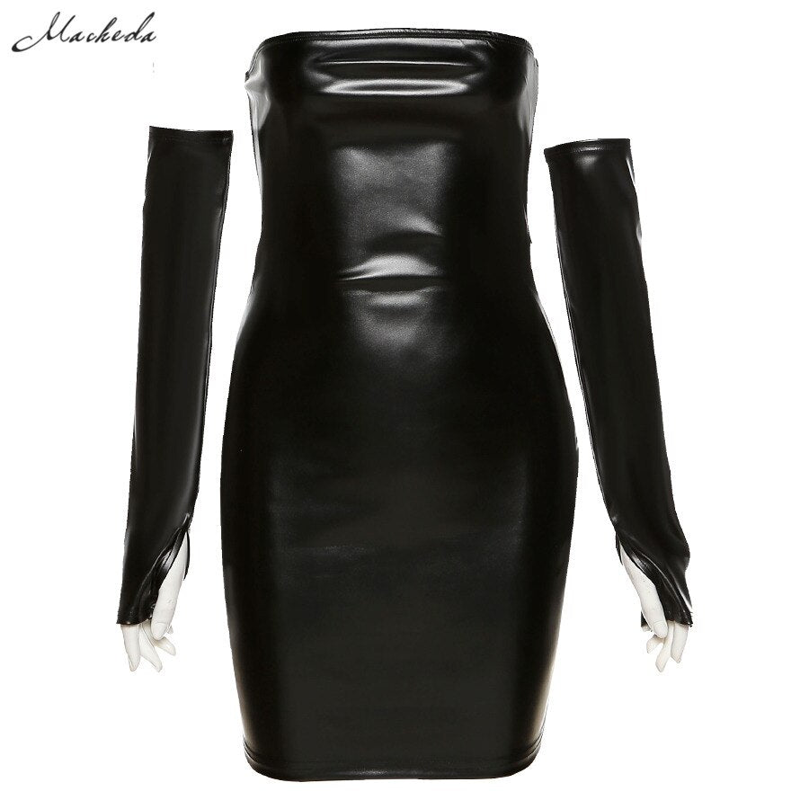 Macheda Autumn Sexy PU leather Slim Dress Women Removable Long Sleeve Strapless Fashion Clothing Lady Solid Mini Bodycon Dresses
