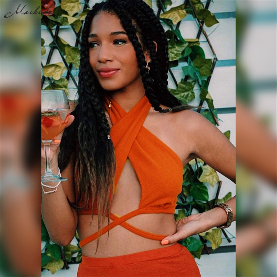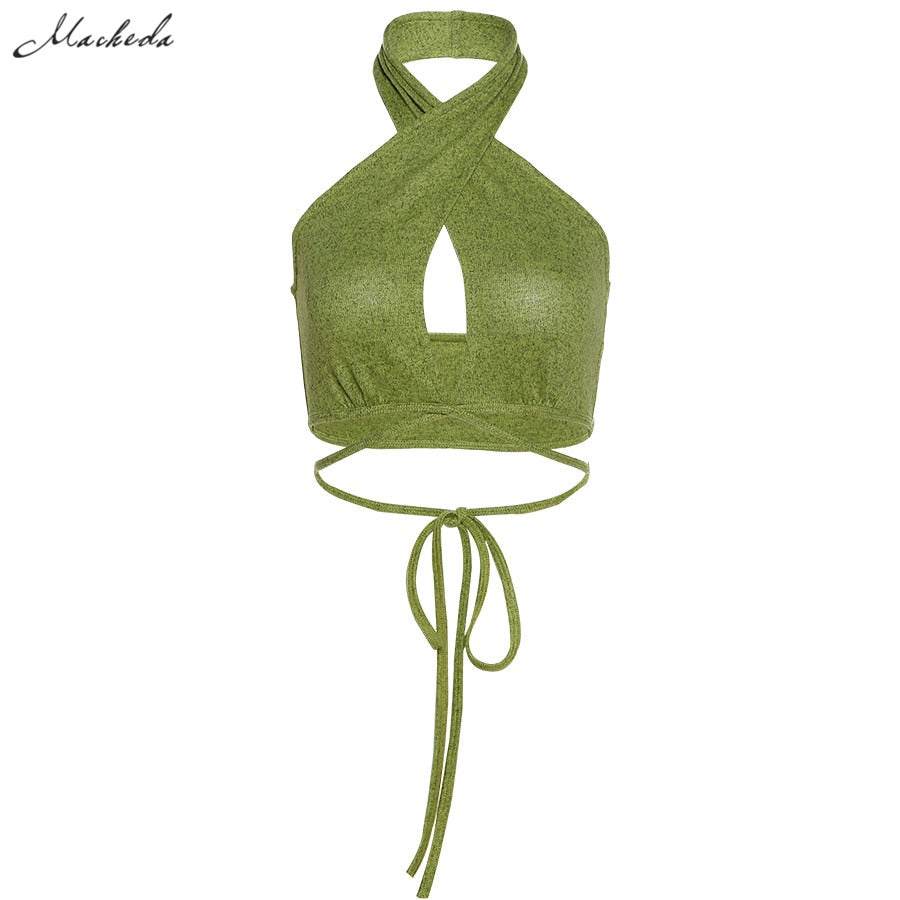 Macheda Autumn Solid Sexy Hollow Out Tank Top Women Fashion Slim Halter Sleeveless Lace Up Clothing Green Lady Casual Crop Top