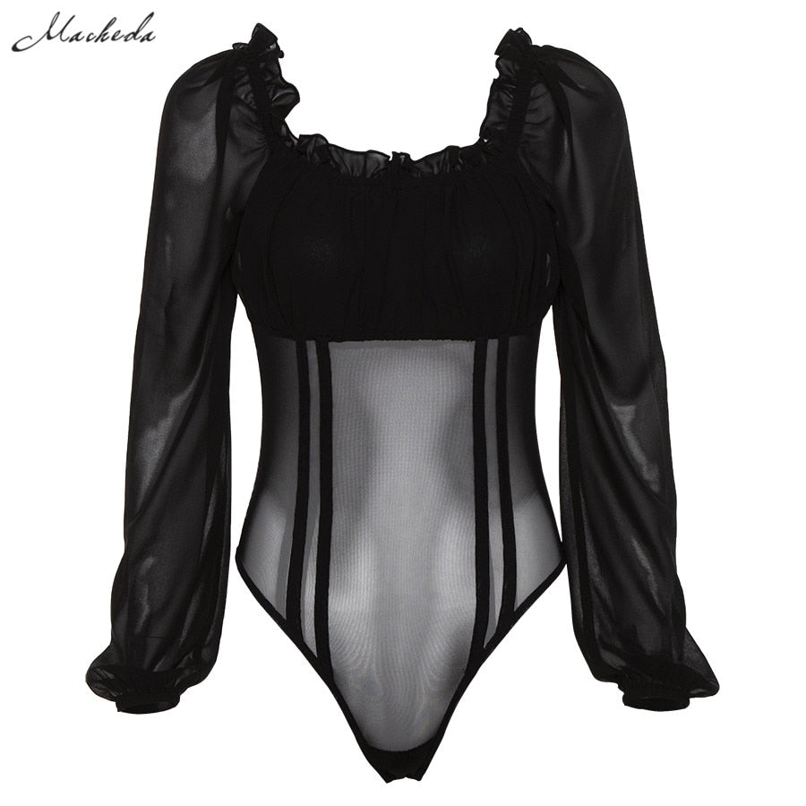 Macheda Black Sexy Mesh See-through Bodysuits Womens Autumn Ruffle Long Sleeve Wear Wild Slim Elegant Off Shoulder Rompers