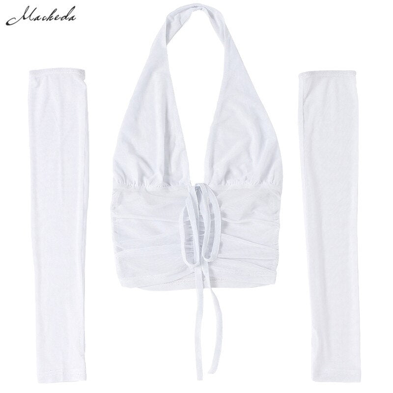 Macheda Fashion Sexy Backless Deep V Crop Top Women Mesh Solid Halter Sleeveless Lace Up Clothing Street Casual Lady Slim Top