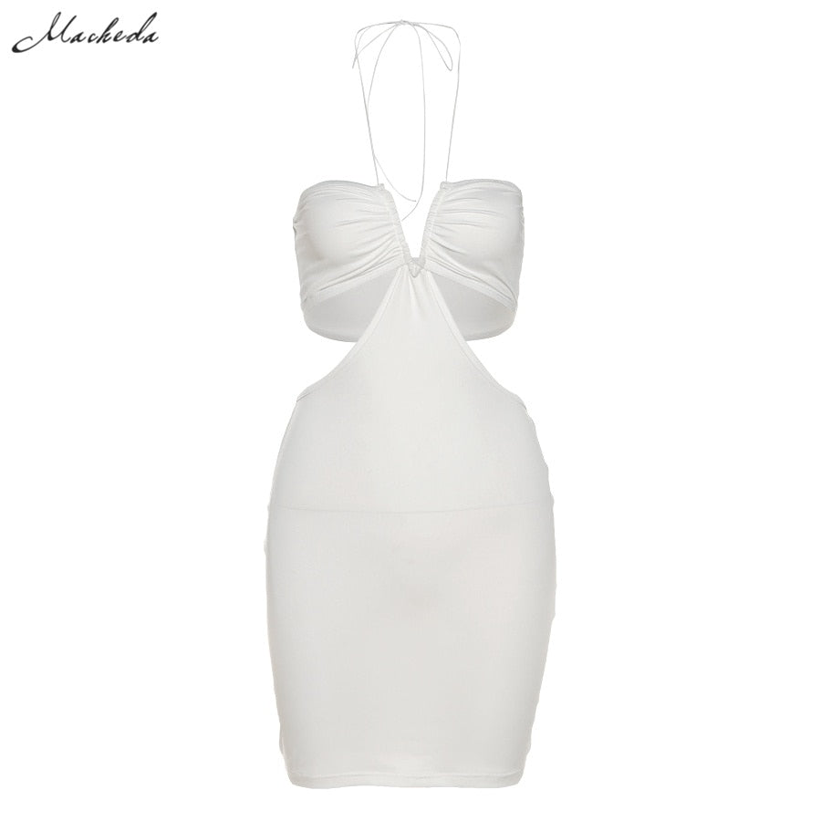 Macheda Summer White Sexy Waist Hollow Out Dress Women Slim Halter V Neck Sleeveless Lady Fashion Street Solid Mini Dresses