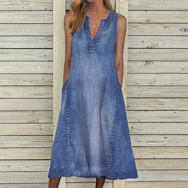 New Sleeveless V Neck Casual Dresses 2021 Spring Pocket A-Line Denim Dress Women Summer Loose Long Beach Dress Mujer Vestidos