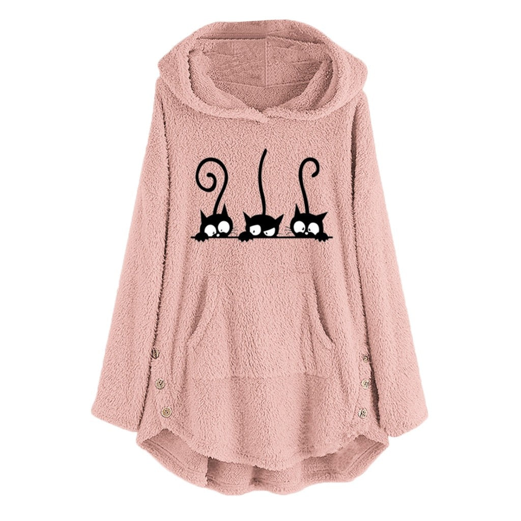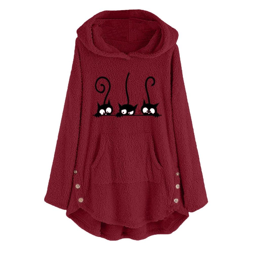 Oversize Hoodie Womens Fleece Teddy Hoodies Cat Print Warm Hooded Pullover Top Sweatshirts Jumper Women Hoodie Sweatshirt 2021