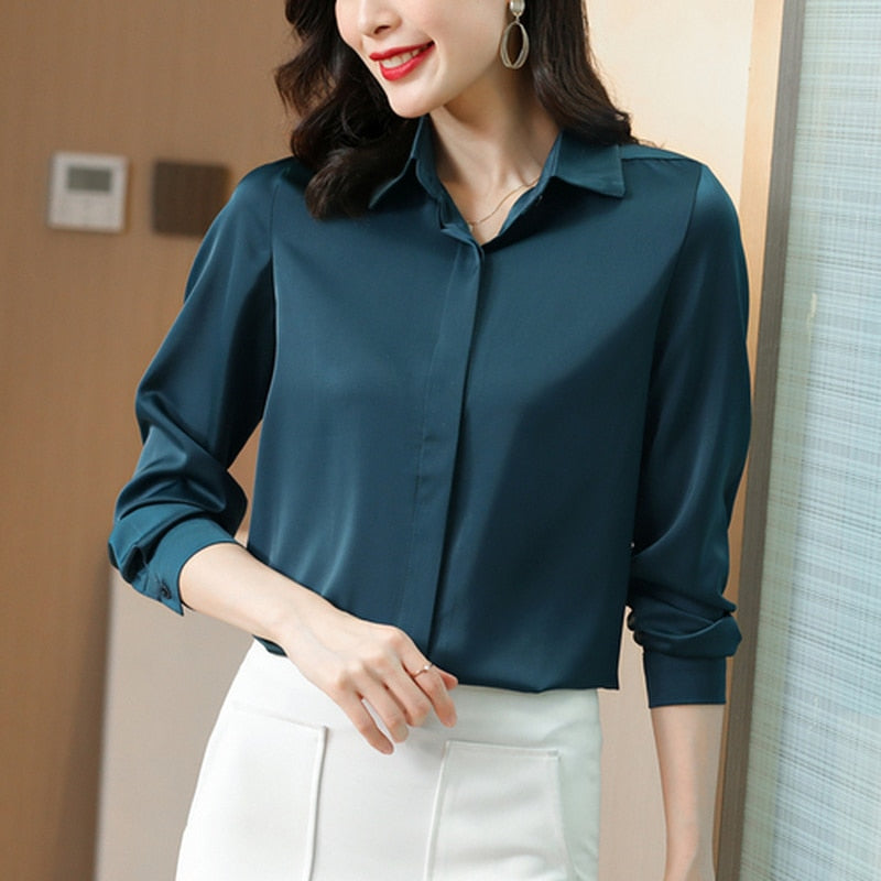 Plus Size Satin Blouse 2021 New Spring Silk Shirt Women Turn Down Collar Loose Office Lady Blouse Long Sleeve Clothes Tops 12793