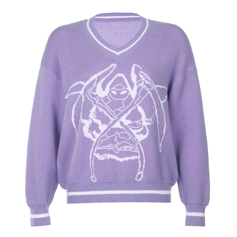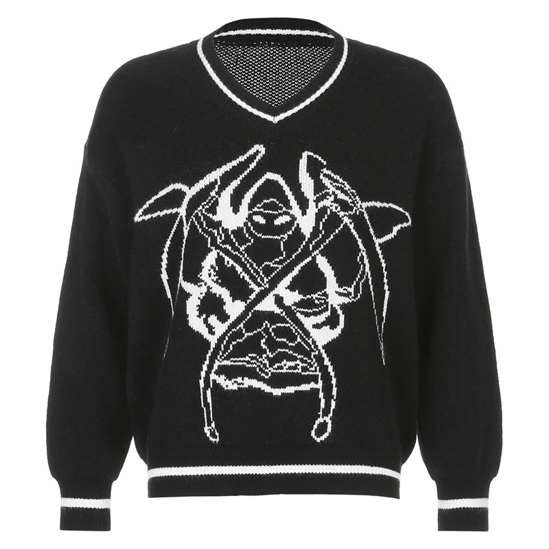 Preppy Style Y2K Sweaters Tops green Women Ovesized Vintage Graphic Print Aesthetic Pullovers V-neck Harajuku Tops Cuteandpsycho
