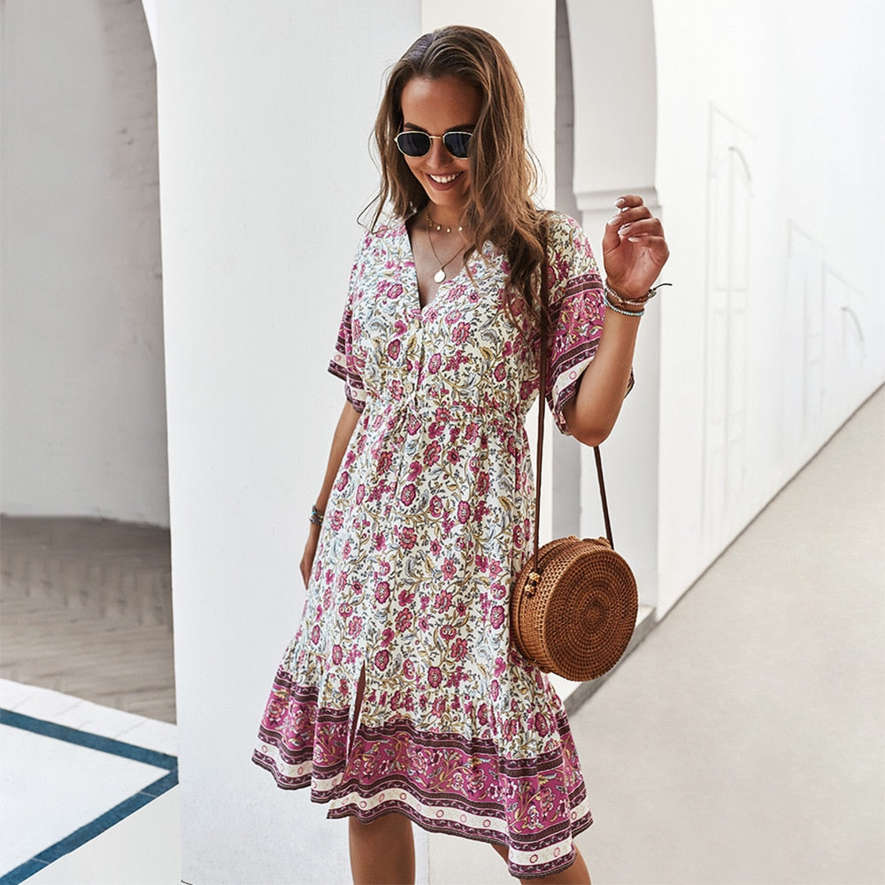 Printed Mini Dresses for Women Party 2021 Summer V-Neck Ruffles Sexy Dress Ladies Short Sleeve Casual Holiday Boho Dress Jurk