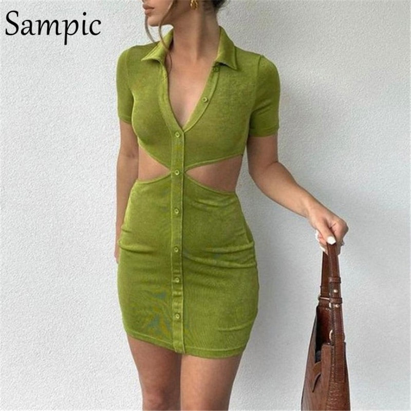Sampic Fashion Women Turn Dow Collar Bodycon Short Sleeve Mini Blouse Dress Summer Party 2021 Cut Out Wrap Club Black Dresses