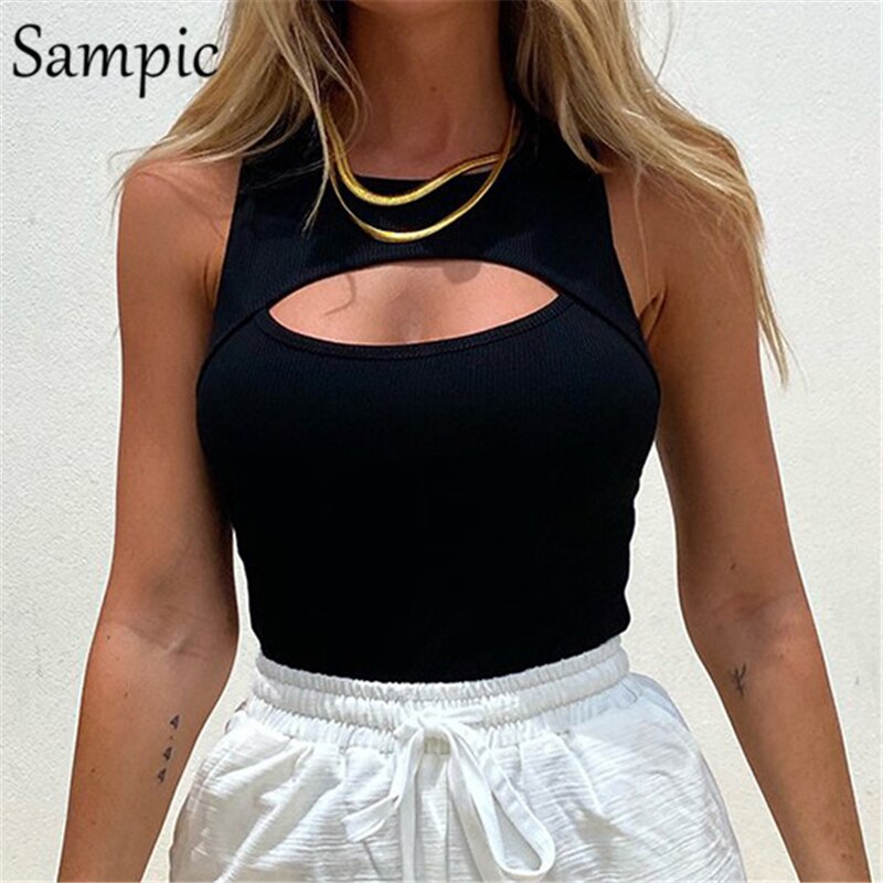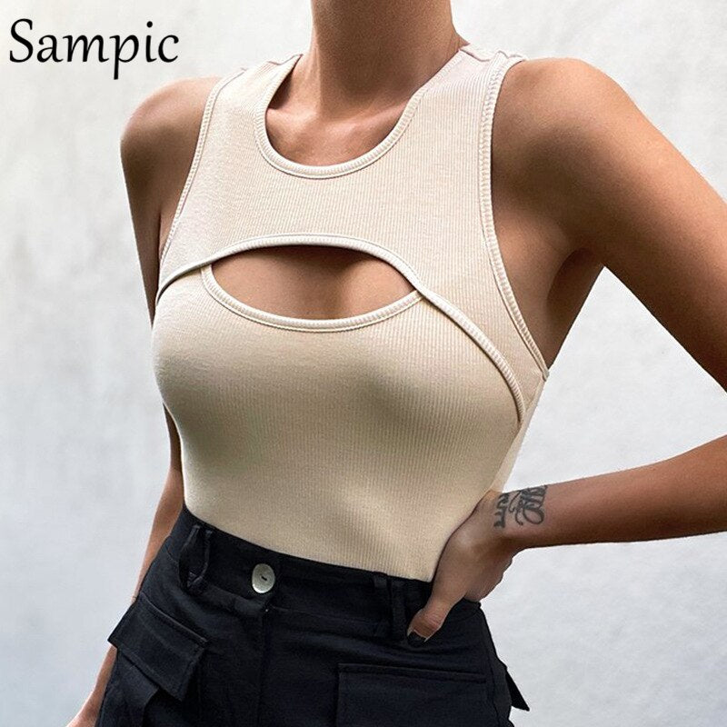 Sampic Khaki Knitted Women Hollow Out Ribber Slim Mini Crop Tops 2021 Summer Sexy Club Cut Out Tank Tops Basic Camis Vest Tosp