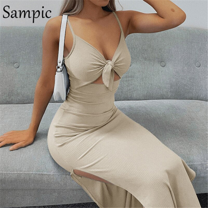 Sampic Sexy Backless Khaki Fashion Women Bandage Hollow Out Long Split Bodycon Dress 2021 Ladies Party Club Knit Cut Out Dress