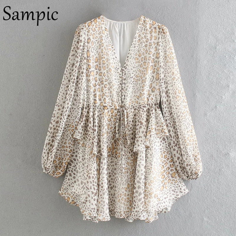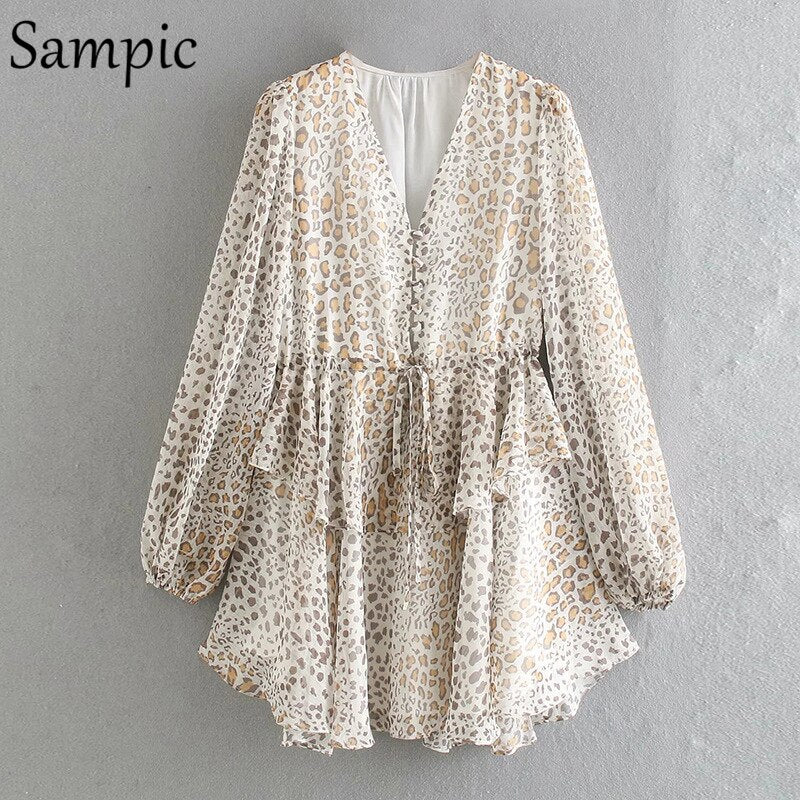 Sampic Sexy Women Chiffon Leopard Print Long Puff Sleeve Mini Party Dress Night Club Black Beige V Neck 2021 Summer Beach Dress