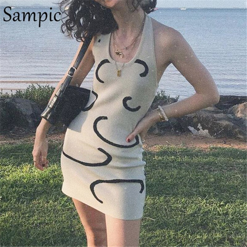 Sampic Sexy Women Summer Beach 2021 Casual Knitted Sweat Halter Mini Dress Ladies Fashion Party Wrap Bodycon Off Shoulder Dress
