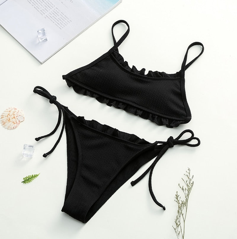 Sexy Bikinis 2021 Cup Black Swimsuit Push Up Biquini Bandage String Bikini Set Folds Swimwear Women Solid Beach Bathing Suit
