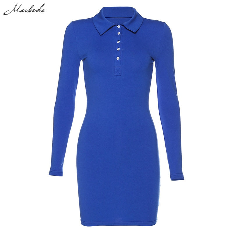 Shestyle Fashion POLO Collar Blue Dress Women Slim Sheath Button Long Sleeve Black Mini Solid Dress Lady Outfit Spring New