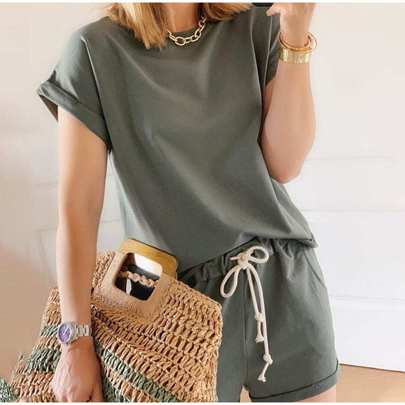 Solid Summer Women's Suit Two Pieces Tracksuit Short Sleeve Sports Suits Women 2021 Casual Tracksuits Elastic Waist Lady Set