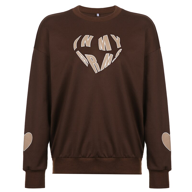 Streetwear Heart Print Y2K Sweatshirts Women Casual Joggers Brown Cloth Loose Cotton Retro Harajuku Shirts Autumn Cuteandpsycho