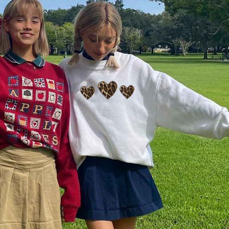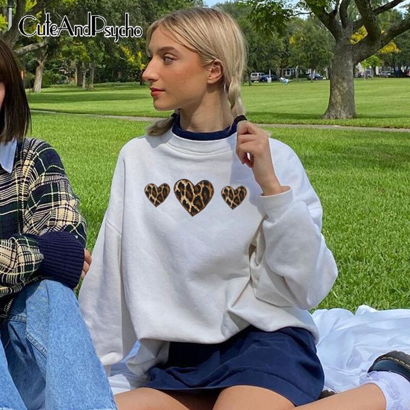 Streetwear Leopard Heart Print Y2K Sweatshirts Women Oversized Vintage Fashion Sweat Shirt Joggers Korean Tops Tee Cuteandpsycho