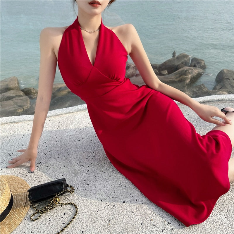 Summer Halter Sexy Backless Midi Bodycon Red Party Sleeveless Dress Beach Holiday Robe