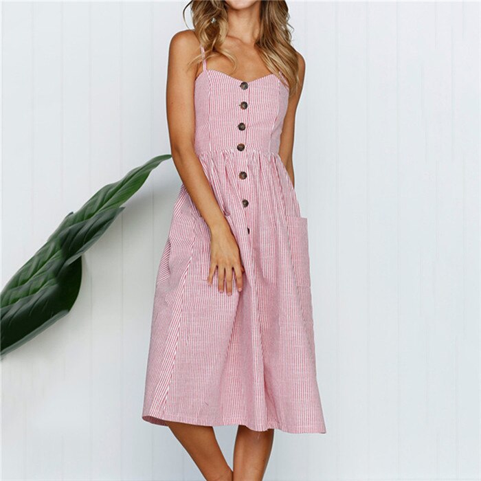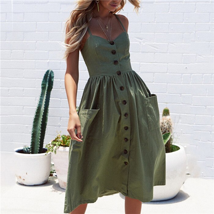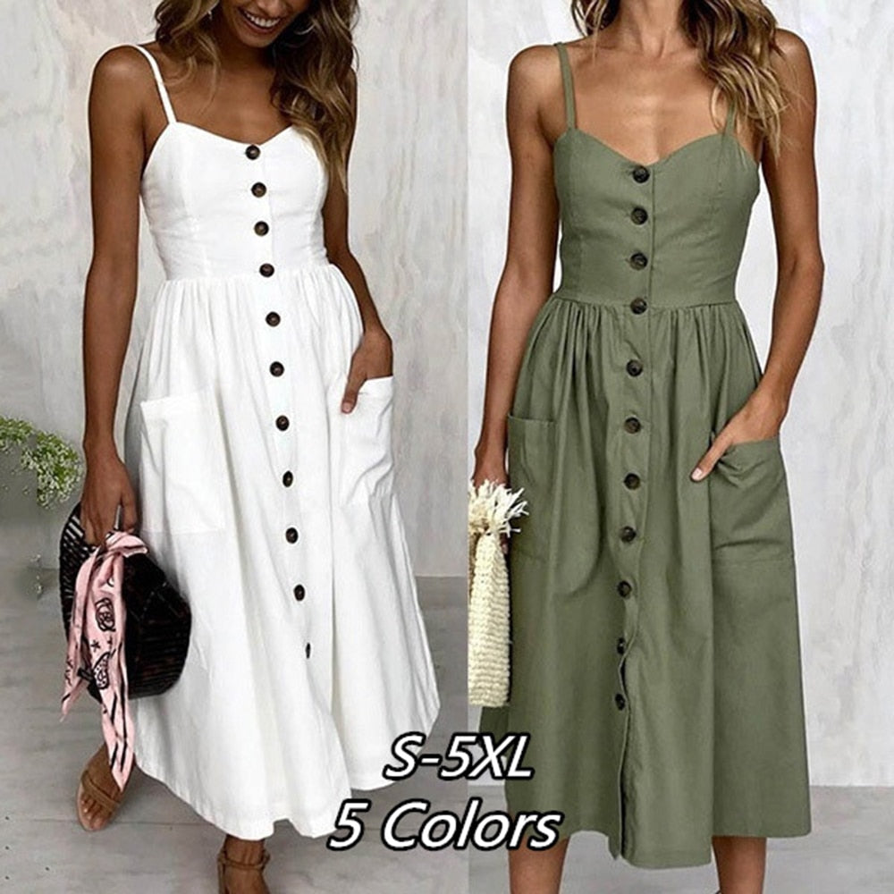 Summer Women Dress Sexy Backless Solid Spaghetti Strap Beach Sundress Casual Button Pocket Sleeveless Female Dress Plus Size