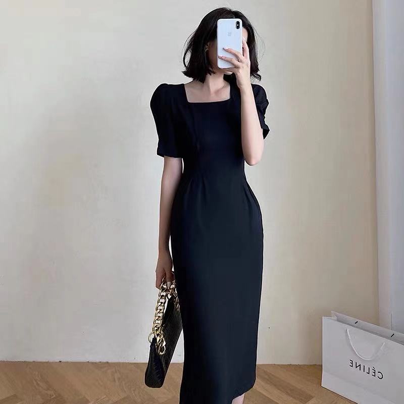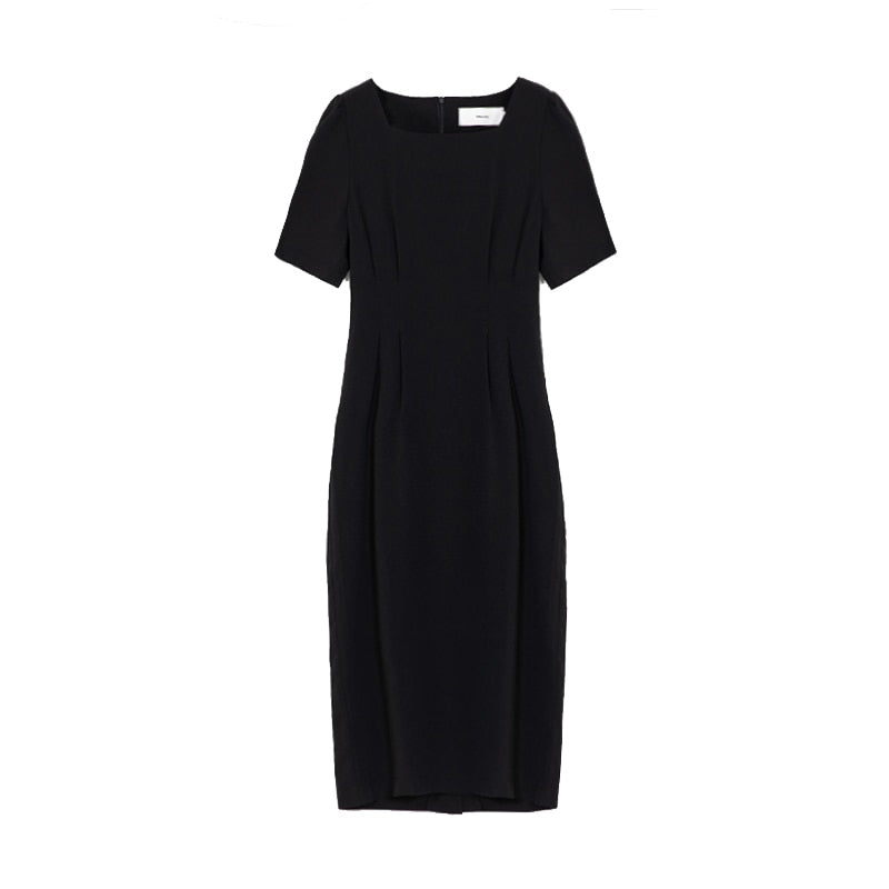 Summer Women Elegant Midi Slim Solid Black Dress Office Lady Fashion Bodycon Puff Sleeve Dress
