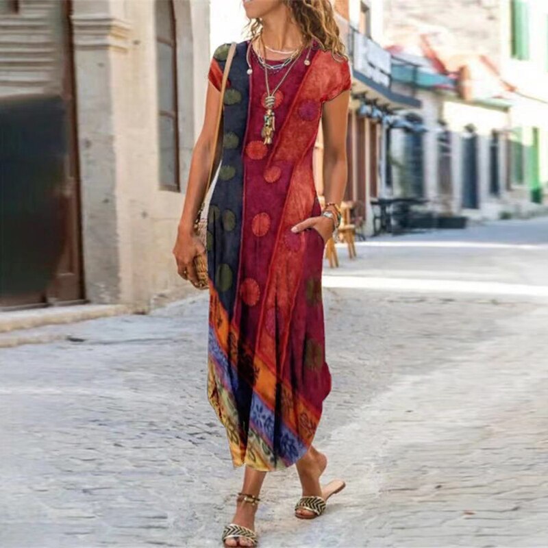Vintage Flower Dress Women O Neck Pocket Summer Casual Dresses For Women Loose Long Dress Plus Size Ladies Vacation Party Dress
