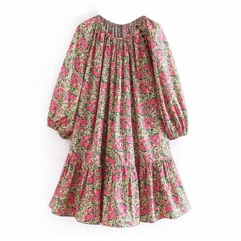 Vintage O Neck Loose Dress Women Floral Print Lantern Long Sleeve Chic Short Dresses 2020 Spring Casual Pleated Mini Dress
