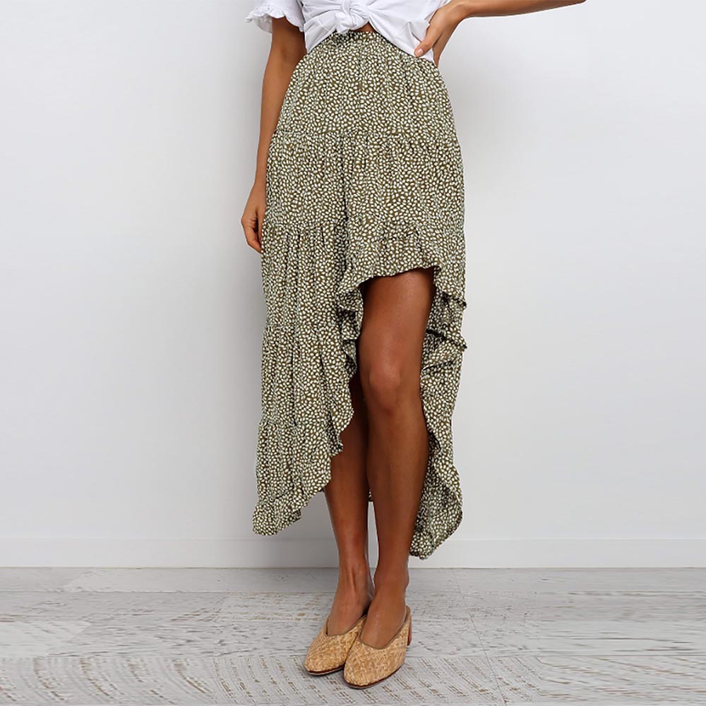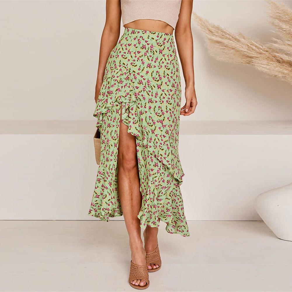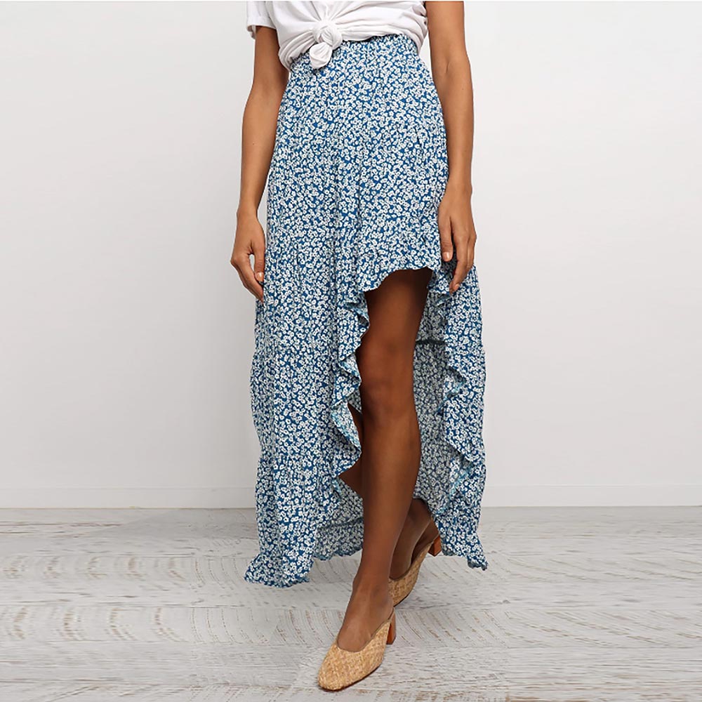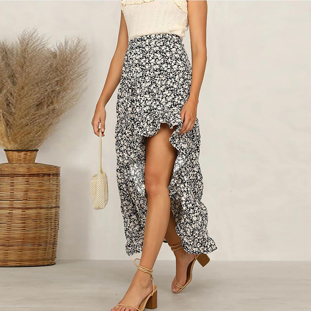 WildPinky Bohemian Black Ruffle Hem Wrap Floral Print Skirts Women Summer Elastic High Waist Ladies Irregular Long Skirt Female
